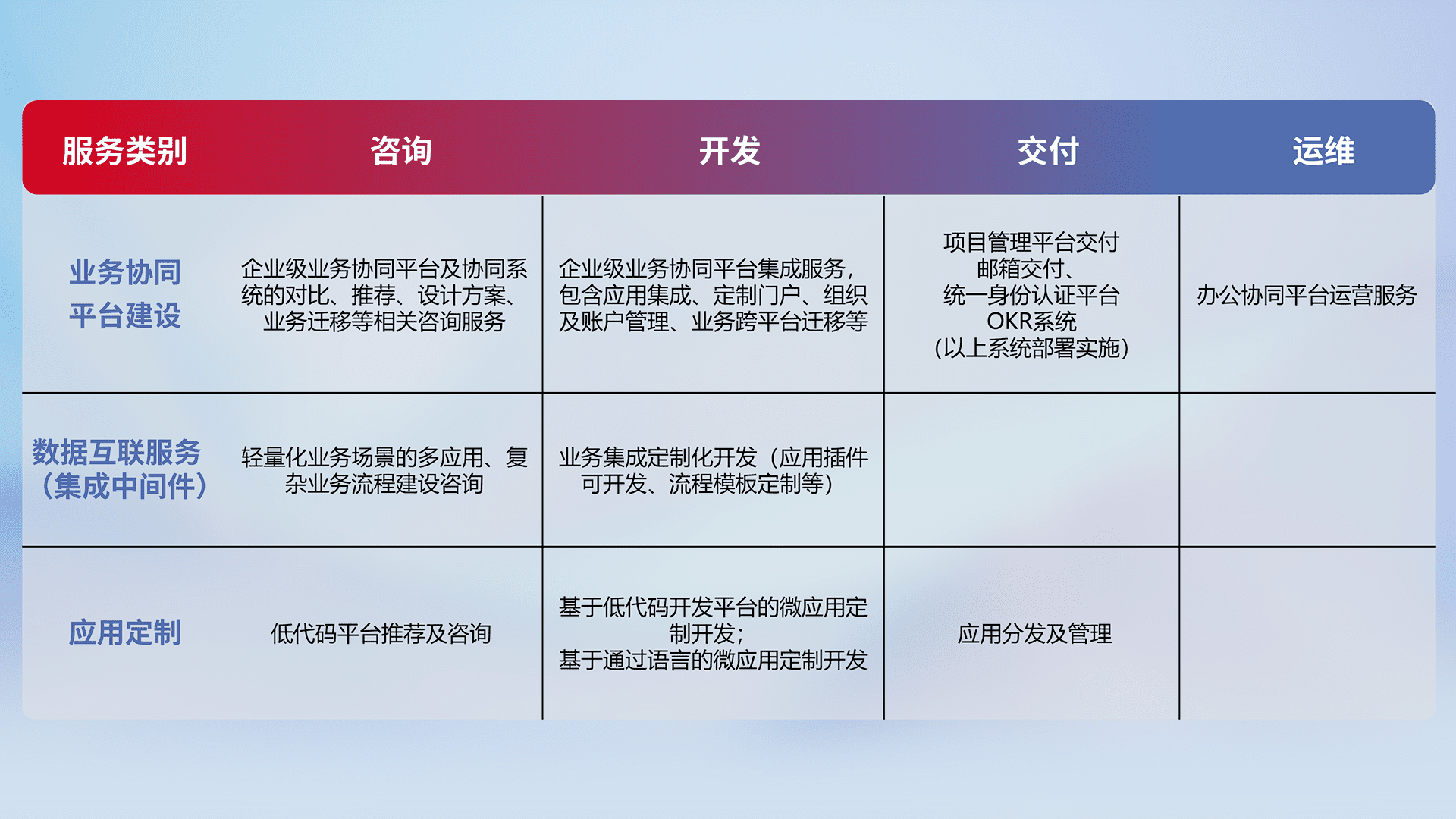 针对钉钉、、、企微、、、、IDaas等平台级产品提供产品的规划、、、方案、、、交付、、、、定制化开发等服务,,,实现如统一协同办公、、智能客户服务、、混合会议管理、、、智能数据查询、、、、等业务场景,,,,实现数字化转型。。。